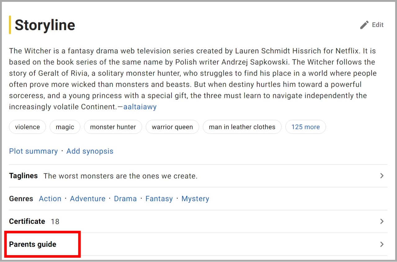 쭉 내리다보면 Storyline 항목이 있는데 여기서 Parents Guide를 찾을 수 있다. 클릭하면 선정성, 폭력성, 욕설 등에 대한 정보가 있다