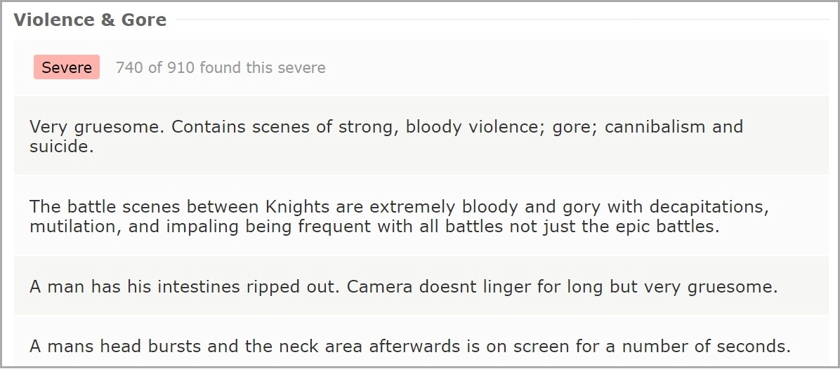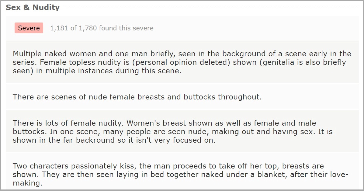 이 외에도 술, 마약, 담배 혹은 고어한 장면 등 걱정할 만한 모든 내용이 서술되어 있다. 심각성을 None, Mild, Moderate, Severe로 분류하는데 이 4가지 분류 기준은 시청자가 투표하는 것으로 주관적인 수치지만 대체적으로 맞다. Severe에 가까울수록 더 자극적이라 생각하면 된다