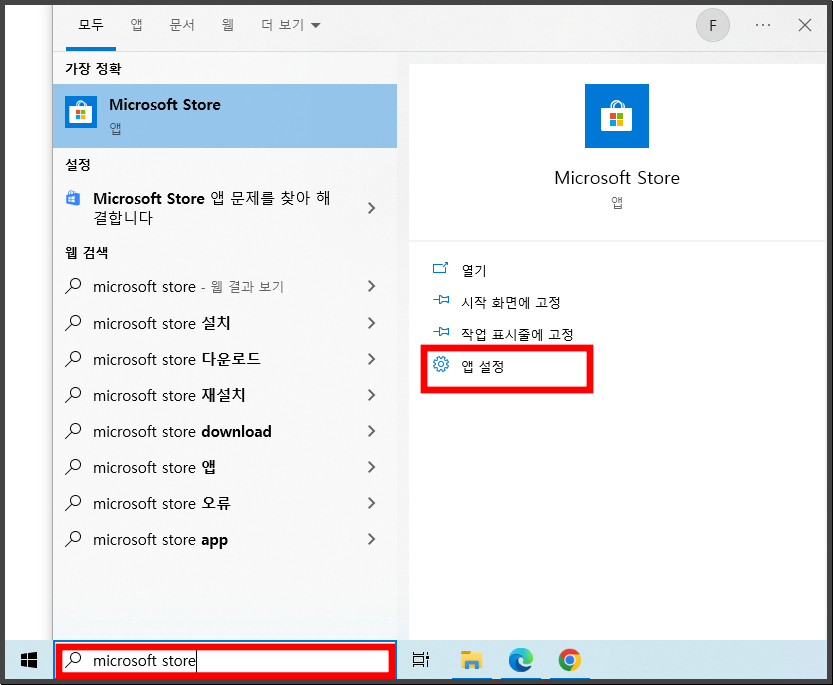 먼저 컴퓨터 좌측 하단 윈도우 모양을 클릭한 후 마이크로소프트 스토어를 우클릭 해 '앱 설정'에 들어간다
