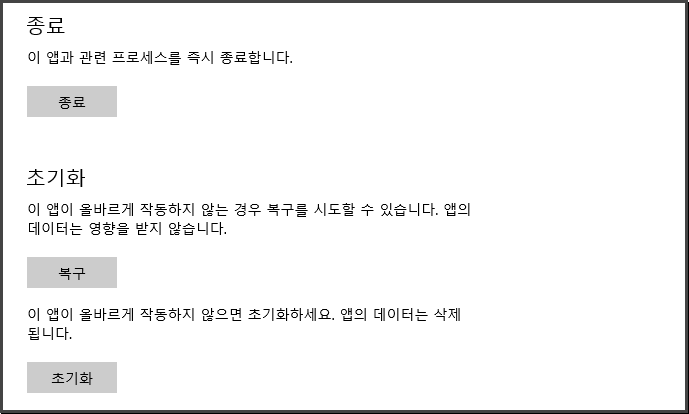 두 번째로 앱을 초기화하는 방법이 있다. 필자의 경우 재설치 없이 해당 방법으로 마이크로소프트 스토어가 실행되지 않는 현상을 고칠 수 있었다