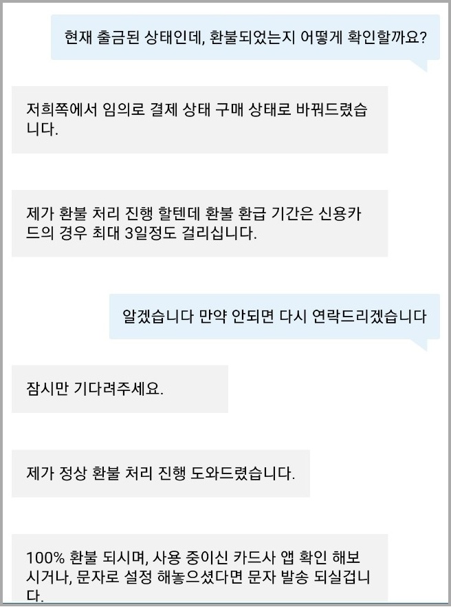 결제 수단에 따라 환불에 걸리는 시간이 다른데, 신용카드와 체크카드는 3일 정도 걸린다. 100% 환불을 받을 수 있었던 이유는 내가 결제 문자를 보자마자 환불을 요청했기 때문이다.