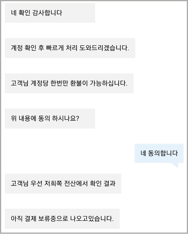 개인정보 이용에 동의를 구하는데 채팅창에 '동의합니다'라고 입력해주면 된다.