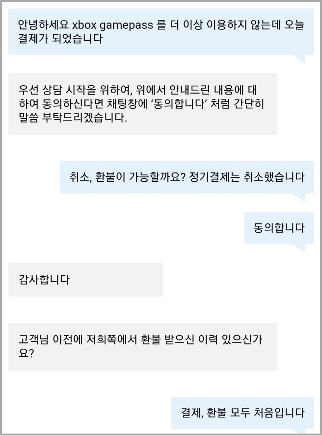 계정 당 한 번만 환불이 가능한 것에 동의를 구한다. 이건 상담원의 재량이 아닌 마이크로소프트의 정책이다. '동의합니다'를 다시 한 번 입력해주면 된다.