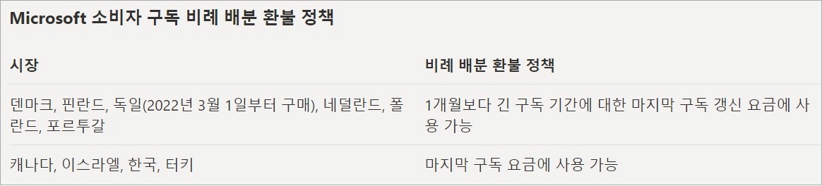 마이크로소프트 정책 상 한국은 비례 배분 환불 국가이다. 예를 들어 30일 중 15일이 지난 후 환불을 요청하면 절반을 환불받게 된다.