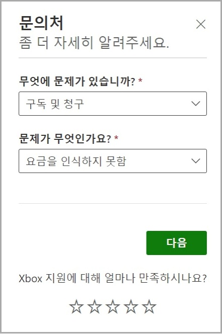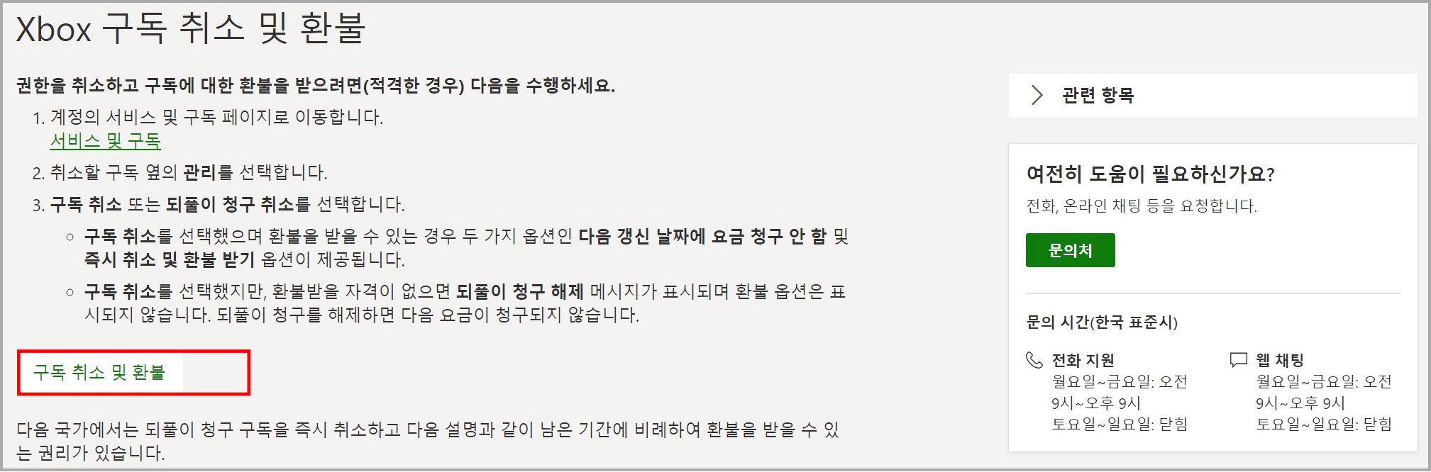 여기까지 왔으면 '구독 취소 및 환불' 버튼이 보이는데 문제는 이 버튼을 눌러도 환불이 안된다. 즉, 게임패스의 경우 마이크로소프트 상품 중 환불 받을 수 없는 상품으로 분류되어 있다. 따라서 우측의 '여전히 도움이 필요하신가요?' 문구 아래 '문의처' 버튼을 클릭한다.